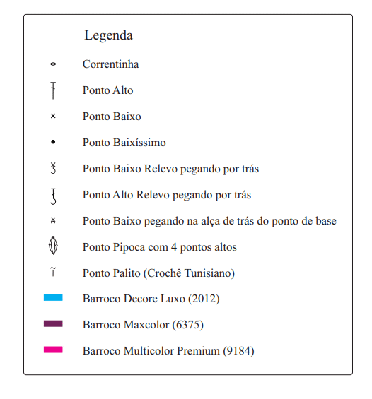 Abreviações: p. (Ponto), pts. (pontos), trab. (trabalhe ou trabalhando), ag. (agulha), rep. (repetição ou repetições), rem. (rematar), acomp. (acompanhando), corr. (Correntinha), p.b.x. (Ponto Baixíssimo), carr. (Carreira); laç. (Laçada); p.b. (Ponto Baixo); p.a. (Ponto Alto), p.b.t. (Ponto baixo relevo pegando por trás), p. palito (Ponto Palito (crochê tunisiano): para cada carr. de ponto palito são trab. 2 carr. 1 de ida e 1 de volta, na carr. de ida trab. introduzindo a ag. no p. de base, e reservando a laç. na ag., na carr. de volta, tira-se as laç. da ag. de 2 em 2 reservando a última laç. para iniciar a próxima carr.).