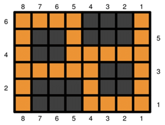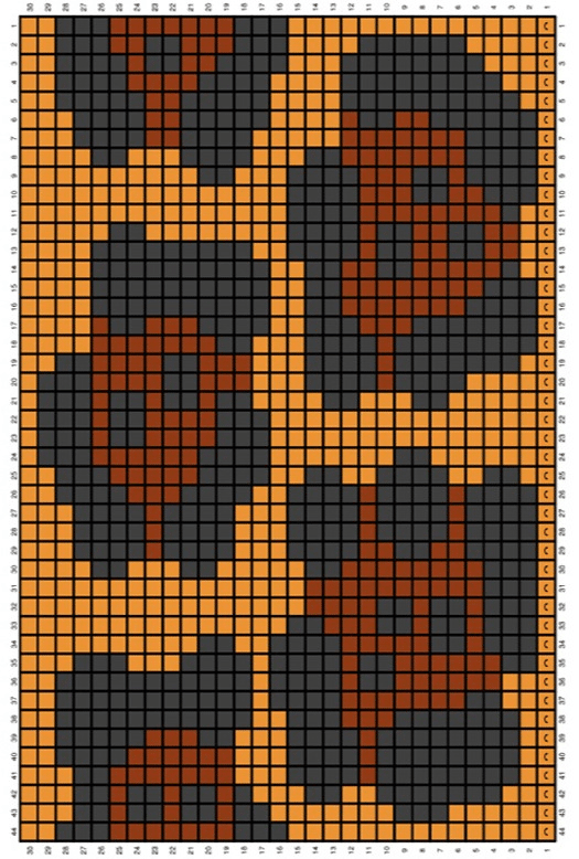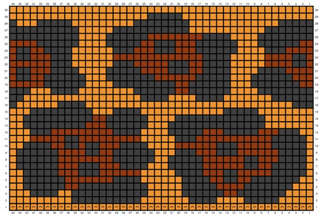 Trabalhe as trocas de cor de acordo com o gráfico abaixo. O padrão apresentado no gráfico será repetido por 9 vezes na vertical para completar o tamanho da alça. O gráfico deve ser lido da direita para a esquerda nas carreiras ímpares e da esquerda para a direita nas carreiras pares