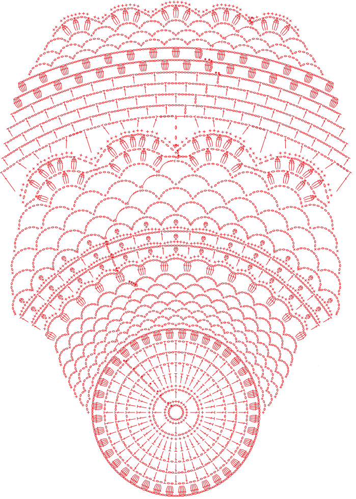 Execução: Com o fio na cor carmim, fazer 16 correntinhas, fechar em círculo com 1 p. bxmo. e seguir o gráfico.