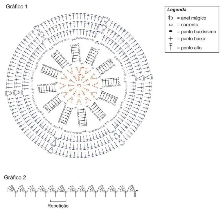 - Mantenha o padrão de pontos altos e correntes, finalizando com um ponto baixíssimo e arremate.