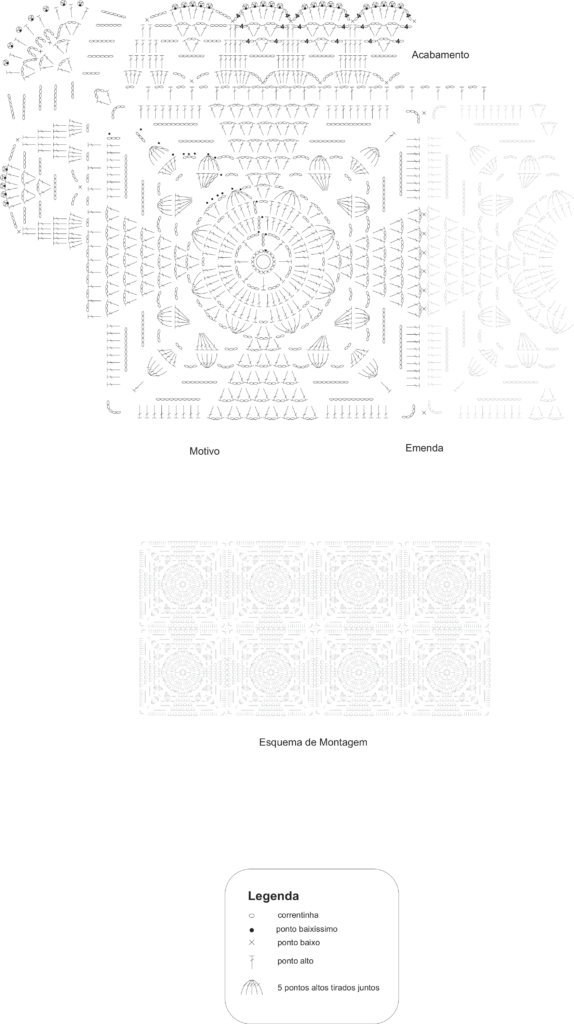 Pontos usados: correntinha (corr); ponto baixo (p.b.); ponto baixíssimo (p.bxmo); ponto alto (p.a.); 5 pontos altos tirados juntos. Execução: Inicie com o anel mágico e trabalhe 12 p.b. dentro dele. 2ª carr: 6 corr, pule 1 p.b., *1 p.a. no p.b. seguinte, 3 corr, pule 1 p.b.*. Repita de * a * e termine esta e todas as outras carr com p.bxmo na 3ª corr inicial. 3ª carr: Trabalhe na alça seguinte (1 p.bxmo, 3 corr, 4 p.a.), *5 p.a. na próxima alça*. Repita de * a *. 4ª carr: 3 corr, 1 p.a. em cada dos próximos 4 p.a., 2 corr, *1 p.a. em cada dos 5 p.a. seguintes, 2 corr*. Repita de * a *. 5ª carr: 3 corr, 1 p.a. em cada dos próximos 4 p.a. tirando todos juntos, 2 corr, *no espaço faça (1 p.a., 2 corr, 1 p.a.), 2 corr, 1 p.a. em cada dos 5 p.a. seguintes tirando todos juntos, 2 corr*. Repita de * a *. Continue acompanhando o gráfico. Faça 8 quadrados iguais, emendando-os na última carr, conforme Esquema de Montagem. Passe as carr de acabamento ao redor de toda a peça. Artesã: Mariane Machado