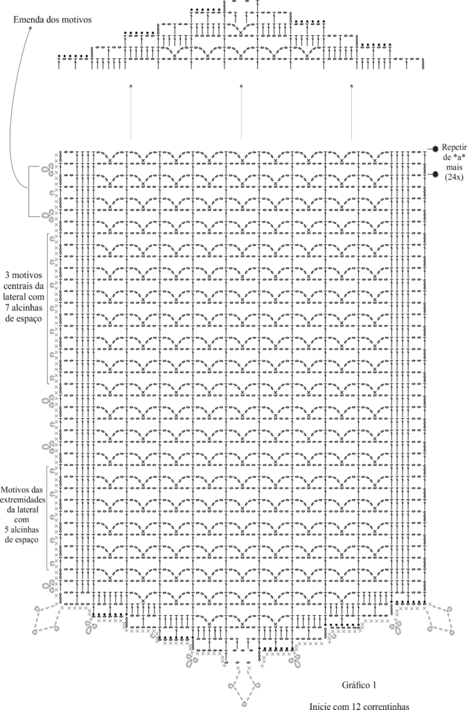Faça 16 motivos iguais e emende na última carr. com p.b. acomp. esquema de montagem.