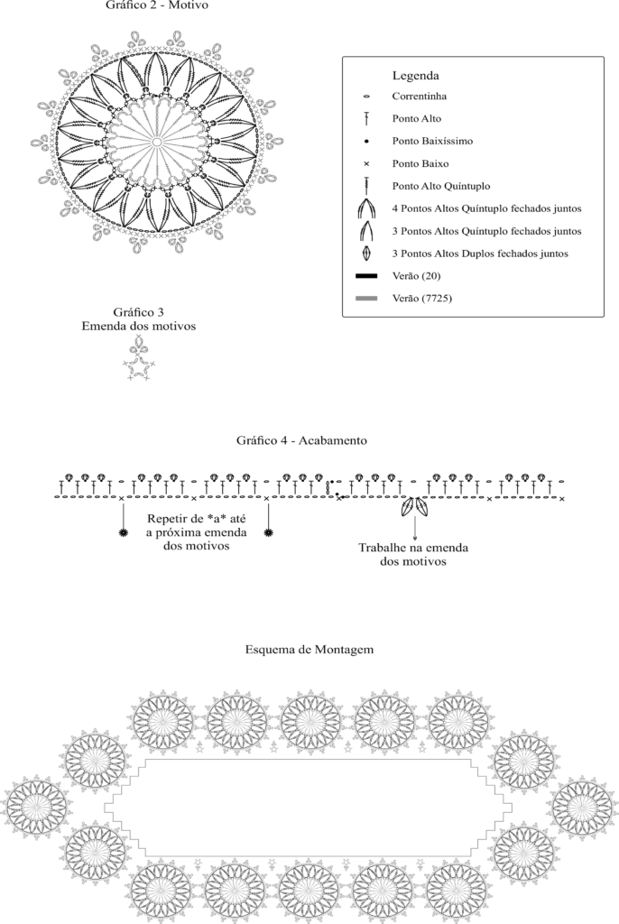 Pontos Utilizados: corr. (Correntinha); p.b. (Ponto Baixo), p.a. (Ponto Alto), p.b.x. (Ponto Baixíssimo), p.a.q. (Ponto Alto Quíntuplo), p.a.q.f.j. (Pontos Altos Quíntuplos fechados juntos), p.a.d.f.j. (Pontos Altos Duplos fechados juntos).