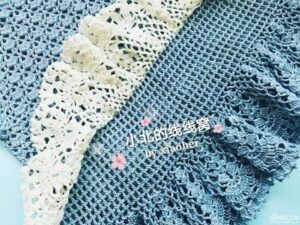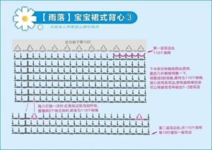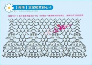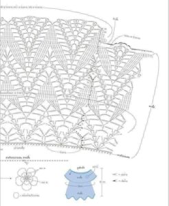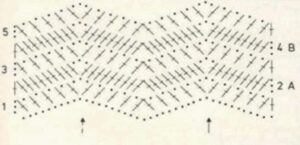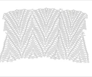 Corpo (2ª etapa): Una o fio abaixo da cava direita e trab. o corpo da peça no p. fantasia (B) acompanhando o diag. 2 e o p. de rep. e o molde. À 33cm de comprimento desde o início finalize a peça com o bico de acabamento acompanhando o diag. 3 e o p. de rep.. Arremate a peça. Após o termino do corpo como acabamento na parte inferior da pala trab. em relevo sobre a peça o bico de acabamento acompanhando o diag. 3 e o p. de rep.. Ao redor do decote trab. 1 carr. de p.b.. Corpo e bico de acabamento trab. em carr. circulares.