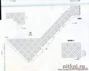 Pala (1ª etapa): Use a ag. de crochê de 2,5mm e o fio Charme na cor cru, inicie a peça pela pala trab. na vertical. Trab. um cordão de 20 corr. sobre este cordão trab. no p. fantasia (A) acompanhando o diag. 1 e o p. de rep.. OBS: O lado onde se inicia as carr. impares representa a borda do decote parte superior da pala. Já as carr. pares representa a borda inferior da pala. A medida da parte superior da pala frente e costas será de (40cm), na parte inferior da pala (110cm).