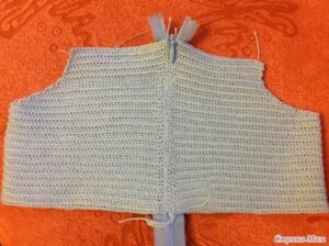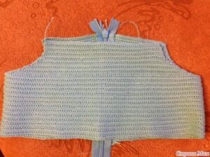 Divisão da pala: Usando um alfinete demarque as cavas (11cm) em cada lateral (observe o p. demarcado com as estrelas em azul). Faça agora de cada lado um cordão de 3 corr. (1cm), unindo a parte das costas e parte da frente da pala. OBS.: Ao fazer esses cordões formam-se as partes inferiores das cavas.