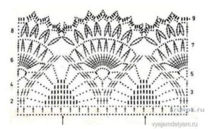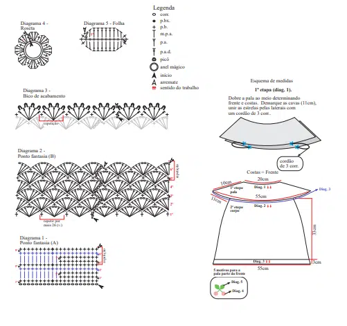 Pontos utilizados no crochê: Corr.: correntinha P.bx.: ponto baixíssimo P.b.: ponto baixo M.p.a.: meio ponto alto P.a.: ponto alto Picô – 3 corr., 1 p.bx., laçando a 1ª corr. Ponto fantasia (A): siga o diag. 1 Ponto fantasia (B): siga o diag. 2 Bico de acabamento: siga o diag. 3, Roseta: siga o diag. 4, Folha: siga o diag. 5.