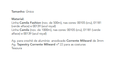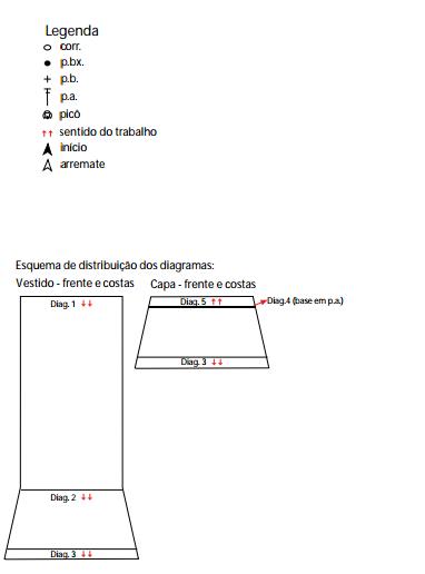 Abreviaturas e pontos empregados: Ag. – agulha, p. – ponto, – pts. – pontos, trabalhe, trab. – trabalhe, nov. – novelo, carr. – carreira, rep. – repetição, diag. – diagrama, corr. – correntinha, p.bx. – ponto baixíssimo, p.b. – ponto baixo, p.a. – ponto alto, picô – 3 corr., 1 p.bx., laçando a 1ª corr., ponto caranguejo – é o p.b. trabalhado da esquerda para a direita.