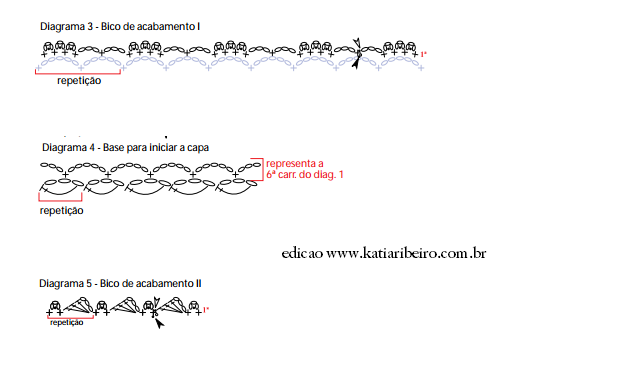 Finalize a peça fazendo o bico de acabamento I acompanhando o diag. 3 e o p. de rep..Trab. em carr. circulares e feche cada carr. com 1 p.bx.. Acabamento: corte o elástico um pouco menor que o cordão inicial de corr. na qual se iniciou a peça. Use a ag. Tapestry nº 22 e costure o elástico pelo avesso da peça com p. de alinhavo. • Capa – com a ag. de crochê de 3mm e o fio Camila (duplo) na cor cru, inicie a peça pela parte superior frente e costas de uma só vez. Com um cordão de 270 corr, 1 p.bx. para fechar o arco. Trab. sobre este cordão acompanhando o diag. 1 e os pts. de rep. a partir da 6ª carr. até atingir 4 desenhos. Cada desenho será formado a cada 6 carr. na troca de cores dos fios Camila. Finalize a peça fazendo o bico de acabamento I acompanhando o diag. 3 e o p. de rep..Trab. em carr. circulares e feche cada carr. com 1 p.bx..