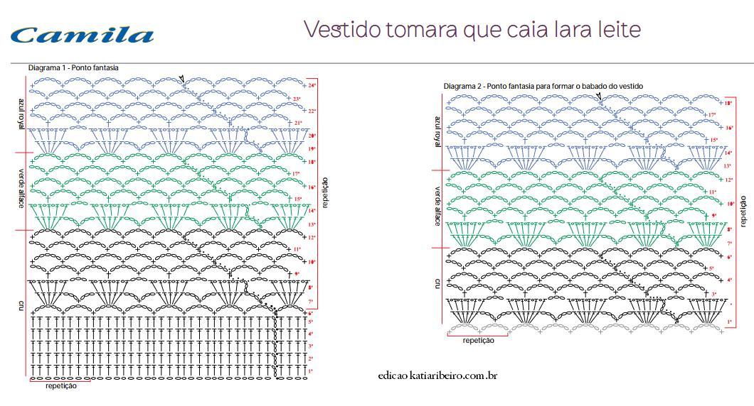 Vestido – com a ag. de crochê de 3mm e o fio Camila (duplo) na cor cru, inicie a peça pela parte superior frente e costas de uma só vez. Com um cordão de 196 corr, 1 p.bx. para fechar o arco. Trab. sobre este cordão acompanhando o diag. 1 e os pts. de rep. até atingir 9 desenhos. Cada desenho será formado a cada 6 carr. na troca de cores dos fios Camila. Nas 3 últimas troca de cores trab. acompanhando o diag. 2 e os p. de rep.