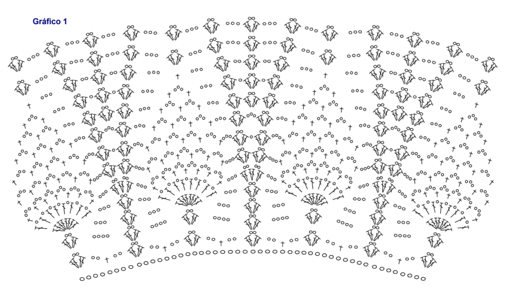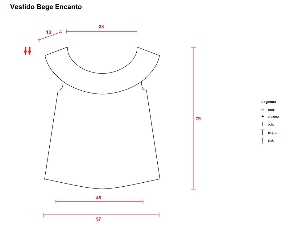 A execução do corpo do vestido segue padrões estabelecidos pelas carreiras iniciais. Nas primeiras carreiras, o leque básico é mantido, composto por dois pontos altos, duas correntinhas e mais dois pontos altos. Com o avanço das carreiras, o leque é expandido e outros grupos de pontos são adicionados, como grupos de pontos baixos e correntinhas.
