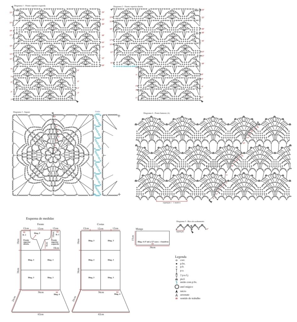 P.: ponto, pts.: pontos, v.: vezes, trab.: trabalhe ou trabalhando, ag.: agulha, diag.: diagrama, rep.: repetições, rem.: rematar, comp.: comprimento, acomp.: acompanhando, seg.: seguinte.