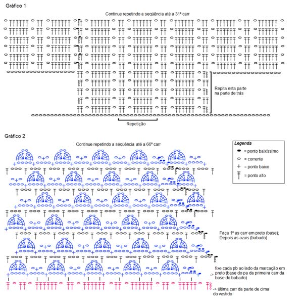 1ª carr: 1 pbxíssimo entre os 2 pa e os 6 pa da 1ª carr da parte de cima do vestido, 3 corr para subir, 3 corr, 1 pa entre os 6 pa e os próximos 2 pa, 3 corr, *1 pa entre os 2 pa e os próximos 6 pa, 3 corr, 1 pa entre os 6 pa e os próximos 2 pa, 3 corr*, repetir de * a * mais 2 vezes, #1 pa nas corr, 3 corr#, repetir de # a # mais 10 vezes, repetir de * a * 8 vezes, repetir de # a # 11 vezes, repetir de * a * 4 vezes, 1 pa no último ponto.