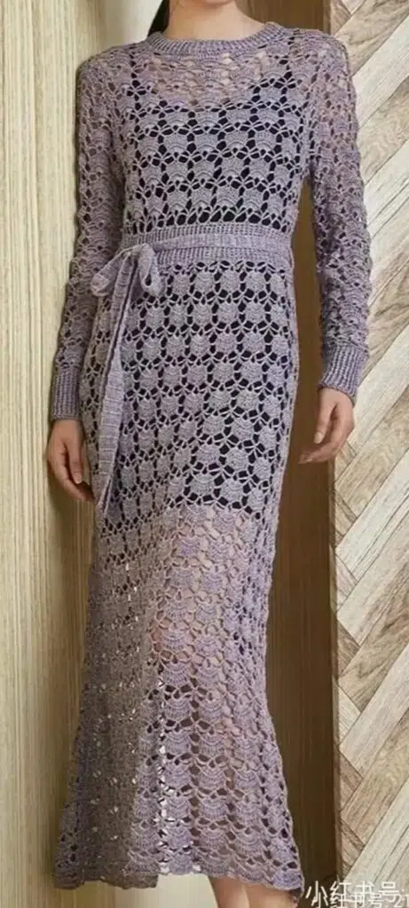 - Vestido longo com mix de pontos: alterna carreiras de pontos abertos e fechados, criando movimento visual.