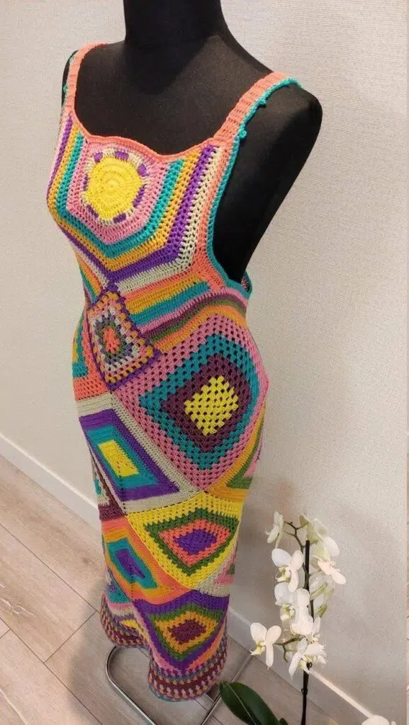 - Vestido justo de crochê com ponto cruzado: moderno e urbano, valoriza a silhueta e combina bem com jaquetas ou botas.